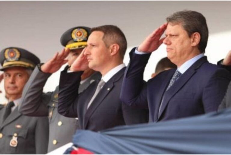 Foto Governador de São Paulo. Tarcísio de Freitas. faz continência durante evento ao lado do secretário de Segurança Pública, Guilherme Derrite (Foto: Carol Jacob/ALESP/Divulgação)