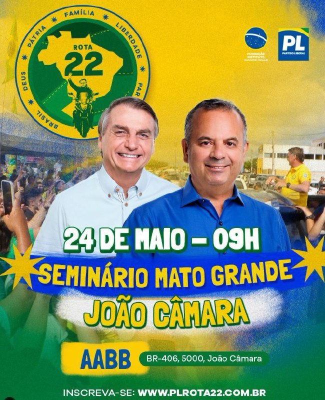 A próxima parada do Projeto Rota 22 no Rio Grande do Norte será um seminário do PL no município de João Câmara, neste sábado (24), às 9h, na AABB, debatendo o desenvolvimento das regiões do Mato Grande e Litoral Norte. As inscrições são gratuitas e podem ser feitas pelo site: www.plrota22.com.br.